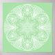Dieses weiße Mandala sitzt auf einem weichen grünen Hintergrund. Die Farben sind ruhig und kreativ. Teil der Howlsplann Mandala Kollektion.
