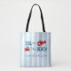 Boil on the beach! Seafood boil bachelorette weekend with a crab and lobster against a coastal blue striped background