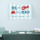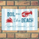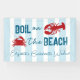 Boil on the beach! Seafood boil bachelorette weekend with a crab and lobster against a coastal blue striped background