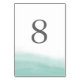 Strandfarbene Tischnummern in sanften Farbtönen, grün und weiß, mit einer Aquarellwäsche am unteren Ende, die den Gezeitenfluss und Ebbe der Gezeiten hervorruft, mit einer Tischnummer in mittlerem Grau. Design wiederholt sich auf der Rückseite. Koordiniert mit unserer Seaglass Tides Hochzeitssuite.