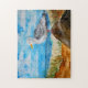 traditionelle Landschaftsbilder in Aquarellfarben, die ein wenig seetüchtig auf einem Felsen vor einem Sandstrand liegen, blaue Ozeanwellen und einen blauen bewölkten Himmel.