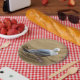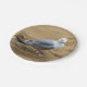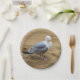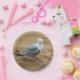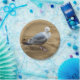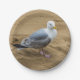 Ein nahes Foto einer Möwe auf einem Sandstrand auf einer Papiertüte.