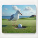 Ein Seegras platziert einen Golfball im Loch, das Set vor einer landschaftlichen Kulisse eines Golfplatzes am Meer