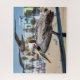 Schönes California Brown Pelican posiert für sein Portrait auf dem Pier in Huntington Beach, CA, nur um von Seagull fotografiert zu werden.