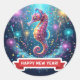Realistic vibrant seahorse floating in a colorful underwater scene with tiny sparkling bubbles and confetti. Bright, photorealistic, and festive Happy New Year sticker.