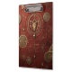 An ornate emblem glows in gold against a textured crimson backdrop, surrounded by arcane symbols and cryptic inscriptions.
