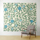 Seamless floral pattern with blue flowers, green leaves, and twisting vines on a light beige background. The design is lively and decorative.