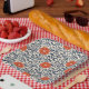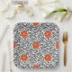 Seamless floral pattern with vibrant orange flowers and navy blue leaves on a beige background, creating an ornate, symmetrical design.