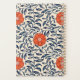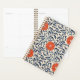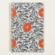 Seamless floral pattern with vibrant orange flowers and navy blue leaves on a beige background, creating an ornate, symmetrical design.
