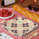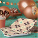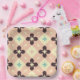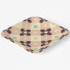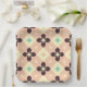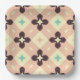 A seamless geometric pattern with cream, beige, and mint green shapes. Bold, dark brown floral designs form a repeating diamond grid. Retro vibe.