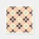 A seamless geometric pattern with cream, beige, and mint green shapes. Bold, dark brown floral designs form a repeating diamond grid. Retro vibe.