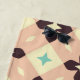 A seamless geometric pattern with cream, beige, and mint green shapes. Bold, dark brown floral designs form a repeating diamond grid. Retro vibe.