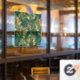 Seamless pattern of gold, jewelry, shiny fern branches and leaves on green, woodland, textured background. Golden fern.