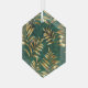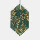 Seamless pattern of gold, jewelry, shiny fern branches and leaves on green, woodland, textured background. Golden fern.