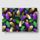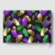 Seamless pattern of bright purple, green, and gold feathers on black Mardi Gras background. Design for the Mardi Gras holiday.