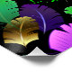 Seamless pattern of bright purple, green, and gold feathers on black Mardi Gras background. Design for the Mardi Gras holiday.