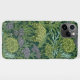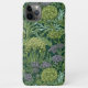 Seamless William Morris style wallpaper pattern featuring dense green foliage and large, rounded flowers in shades of lime green, off-white, and muted lavender against a dark emerald background.