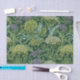 Seamless William Morris style wallpaper pattern featuring dense green foliage and large, rounded flowers in shades of lime green, off-white, and muted lavender against a dark emerald background.