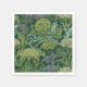 Seamless William Morris style wallpaper pattern featuring dense green foliage and large, rounded flowers in shades of lime green, off-white, and muted lavender against a dark emerald background.