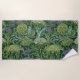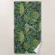 Seamless William Morris style wallpaper pattern featuring dense green foliage and large, rounded flowers in shades of lime green, off-white, and muted lavender against a dark emerald background.