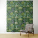 Seamless William Morris style wallpaper pattern featuring dense green foliage and large, rounded flowers in shades of lime green, off-white, and muted lavender against a dark emerald background.