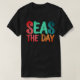 Dieses kühne und farbenfrohe T - Shirt-Design ermuntert Sie zum Abenteuer! Es enthält die Phrase "Seas the Day", geschrieben in einer Mischung lebendiger Farben mit einem kühnen extravaganten Schriftart. Die auffallende Schrift macht dieses Design perfekt für jeden, der den Ozean Liebe und eine Erinnerung will, den Tag mit Begeisterung zu erleben.