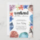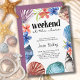Shore Wochenende Junggeselinnen-Abschied Einladung, gerahmt mit Aquarellmuscheln und tropischen Blume. "Wochenende am Ufer" wird per Hand geschrieben und der Rest ist vollständig editierbar.