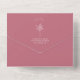 Eine Kunstdarstellung der Blätter in weißer Linie auf dunkelgrünem Hintergrund mit weißem Text und Muscheldesign über rosa Bogen mit gelbem Rand. Draußen ist pink mit Rücksendeadresse und Palmblattbild auf Klappe. UAwg ganz unten.