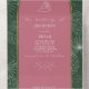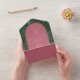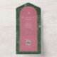 Eine Kunstdarstellung der Blätter in weißer Linie auf dunkelgrünem Hintergrund mit weißem Text und Muscheldesign über rosa Bogen mit gelbem Rand. Draußen ist pink mit Rücksendeadresse und Palmblattbild auf Klappe. UAwg enthält qr-Code.