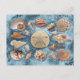 Das ist eine Komposition verschiedener Muscheln auf blauem Korallenhintergrund.