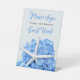 Hochzeitsschild für den Empfang. Dieses stehende Plastikschild frage den Gästen "Bitte unterschreiben (Namen) Gästebuch" und erscheint in vier Größen. Für alle Texte außer den Namen der Braut und des Bräutigams wird ein fett formatiertes, wirbelndes Skript verwendet. Blaues Schild mit hellblauer, realistischer Hydrangea-Blume mit weißem Seestern / Seestern inmitten der Blütenblätter. Siehe dazu passende Artikel in der Design-Linie Seaside Garden.