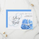 Blaue Blüte speichern die Dattelkarten mit Hydrangea und Seestern-Design. Weißes Papier mit Namen in großen Skripten über einen großen, hellblauen Ampersand (und Schild). Das Blumendesign befindet sich in der unteren Ecke mit "rett unser Datum" und Datum mit der Lage direkt darunter. Das Design ist perfekt für eine Hochzeit am Meer oder eine Sommerfeier.
