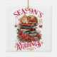 A festive and cheerful Christmas holiday design showcases an adorable kitten curled up on a large stack of books, accompanied by vibrant poinsettias. The scene is surrounded by hearts and stars, while the colorful text reads, "Season's readings." This delightful design is available on a variety of products, making it the perfect gift for book enthusiasts.