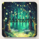 A beautiful evening wedding, engagement, or anniversary with a forest path adorned with fairy lights in the trees, creating a stunning backdrop. A gentle mist lingers in the background of the forest, with countless trees and lights hanging gracefully from their branches.