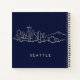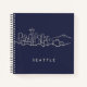 Dieses Design zeigt eine handgezeichnete Skizze der Skyline von Seattle auf einem dunkelblauen Hintergrund.