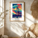 Colorful poster of Seattle featuring the iconic Space Needle, Mount Rainier, and a vibrant sunset sky reflected over the water.