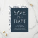 Minimalistisch und elegant speichern Sie die Dattelkarten "Save the Date" in weißen Schriftzeichen, die mit winzigen Blume geschmückt sind, auf einem reichen marineblauen Hintergrund. Personalisieren Sie mit Ihren Namen und Hochzeitsdetails unten. Karten kehren zu einem entsprechenden Blumenmuster zurück.