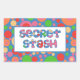 Ein farbenprächtiges Schild mit den "Secret Stash" Labels, mit einem farbenfrohen, leuchtenden und bläsernen Kreismuster auf blauem Hintergrund.