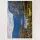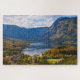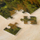 Puzzle des Fotos mit einer Fähre auf See Bohinj, das der Stadt Ribcev Laz mit der vorstehenden Kirche in einer Herbstlandschaft mit Wäldern mit Bäumen in den Herbstfarben in Triglav Nationalpark nahe sich nähert, blutete in Slowenien.