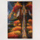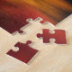 Eine Hütte befindet sich neben einem See, umgeben von einem Wald von Bäumen in Herbstfarben und dem Hauch von hohen Bergen im Hintergrund. Die Bäume und die Hütte spiegeln sich im stillen Wasser des Sees auf diesem schönen Landschaftsjigsaw-Puzzle wider.