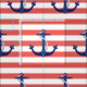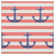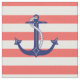 Dieses themenorientierte nautischgewebe kennzeichnet eine Wiederholung der Marineblauanker auf einer Koralle und einem weißen gestreiften Hintergrund.