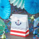 Dieses packt themed Babyduschennautischbevorzugung Eigenschaft ein, die ein patriotischer Anker mit US Flagge verzierte. Hintergrund ist mit einer Ordnung des Seeseils und der roten und weißen gestreiften Grenze hellblau. "Danke!" ist unter der vorderen Klappe und der Beispieltext "des Bethanys Babyparty" wird über den Anker auf die Rückseite geschrieben, damit Sie personifizieren.