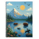 Eine ruhige Seenlandschaft mit Bergen und Wäldern, blauer Himmel, Bären und Enten, die ihr Glück beim Angeln versuchen. Die Grafik ist im Stil der Pixelkunst.