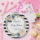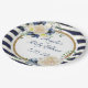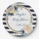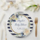 Feiern Sie ein bevorstehendes Bündel Freude mit dieser schön eleganten und noblen Marine, Weiß und GoldPappteller. Kennzeichnet ein atemberaubendes tiefes Marineblau mit Weißstreifen der Hintergrund, betont mit atemberaubenden blauen und weißen Blumenvorbereitungen. Personalisiert zu, was Party Detail Sie benötigt. Groß für eine SeeBabyparty, BlumenBabyparty, etc.
