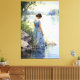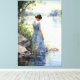 Dieses beeindruckende Aquarellwerk vereint einen Moment ruhiger Introspektion am Ufer des Wassers. Eine junge Frau mit einem fließenden, hellblauen Kleid steht am Rande eines ruhigen Sees. Ihr Blick geht nach unten zum Wasser, ihre Haltung deutet auf eine Touch von Trauer und ein Gefühl von Einsamkeit hin. Die sanften, fließenden Eigenschaften der Aquarellfarbe verstärken die sanfte Melancholie der Szene, die reflektierende Qualität des Sees und die sanfte Drape ihres Kleides. Dieses Stück spricht von Momenten ruhiger Betrachtung, dem Trost der Natur und der Schönheit, die auch in reflektierender Traurigkeit gefunden wird.