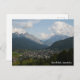 Postkarte mit Foto Seefeld in Österreich eingebettet in Berge mit blauen Himmel und Wolken.