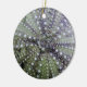 Dieses ist ein Fotobild einer Seeigel-Muschel, die auf eine runde Keramikverzierung gesetzt wird, um sie wie ein Seashell aussehen zu lassen. Seeigel sind Stachelhäuter, die Durchschnitte sie in der gleichen Familie wie Starfish sind. Seeigel sind wirbellose Tiere, die auf einem Exoskeleton beruhen, um ihre Körperstruktur zu geben. Seeigel verschieben sich ungefähr auf Rohr ähnlichen Wimpern mit kleinen Saugern für Füße. Seekelp stellt Nahrung und einen Lebensraum für Seeigel, aber, wenn der Bengelbestand nicht im Karo behalten wird, Seeigel zerstört Kelpbetten innerhalb eines Jahrzehnts zur Verfügung. Seeotter führen Bevölkerungs-Kontrolle auf den Bengeln durch, indem sie sie gefangennehmen und essen. Der Rogen der Seeigel liefert eine reiche Quelle der Nährstoffe.