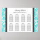 Elegante und zeitgenössische anpassbare acht Tisch Sitzkarte für Hochzeiten in modernen türkisfarbenen aquamarinen blau, schwarz und weiß klassische Blumendampf Vintage Muster. Passen Sie Ihren Namen an, um eine einzigartige Sitzkarte für Ihre Hochzeit zu erstellen. Kontaktieren Sie uns für ein individuelles Diagramm für eine andere Anzahl von Gästen.