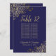 Diese großformatigen Tischnummern zeichnen sich durch ein schlichtes und dennoch elegantes Design aus, das auf einem marineblau-blauen Hintergrund mit einer feinen, goldenen Imitat-Folie mit floralen Filigranen in den Ecken aufwartet. Jede Karte hat Platz für die Namen von 10 Gästen, sodass sie auch als Sitzplan fungieren, sodass die Gäste ihre Tische an ihrem Hochzeitsempfang leicht finden können.