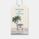 Weihnachtsgeschenke am Strand zur Krawatte auf Geschenke oder Taschen. Ein kleiner Snowboarder liegt direkt am Meer, unter Palmen, die mit Lichtern und Ziergegenständen geschmückt sind. Ecru Hintergrund mit aqua blauer Textvorlage oben. Beispielworte sind "Meere und Grüße von (Name hier)". Ein tropisches Muster bedeckt den Rücken.